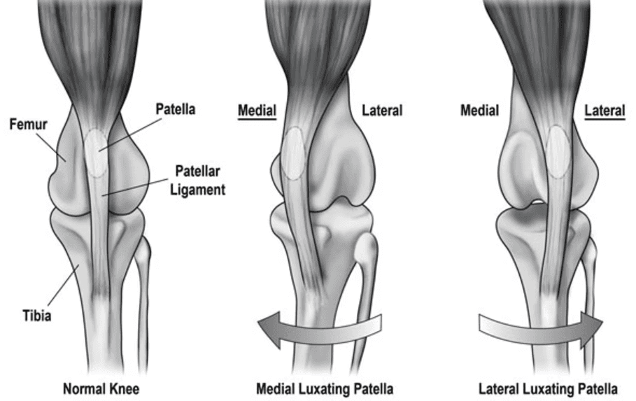 A patellar luxation occurs when the kneecap dislocates from its normal position and slides to the side of the femur. This can occur towards the inside (medial) or the outside (lateral) of the knee. Medial luxations are most common and can occur in dogs and cats of all sizes while a lateral luxation typically affects large breed dogs with limb deformities