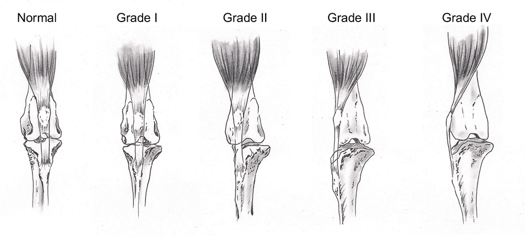 Grade 4: The patella remains dislocated and cannot be reduced to the normal position. These are often due to a bone deformity.