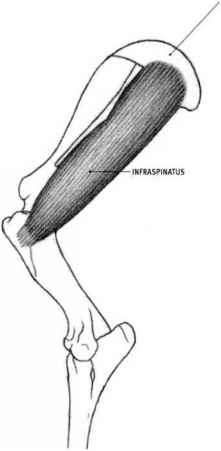 Infraspinatus contracture is an uncommon disease that almost exclusively affects hunting and working breed dogs. It begins with an acute injury to the infraspinatus musculotendinous structure that is observed as a sudden forelimb lameness in the field. The lameness will resolve on its own but then a gait abnormality develops weeks to months later. The dog will hold the paw out to the side and is unable to internally rotate at the shoulder. The initial injury to the infraspinatus heals inappropriately, resulting is a thick, tight fibrous band.
