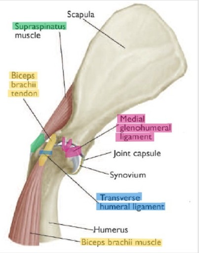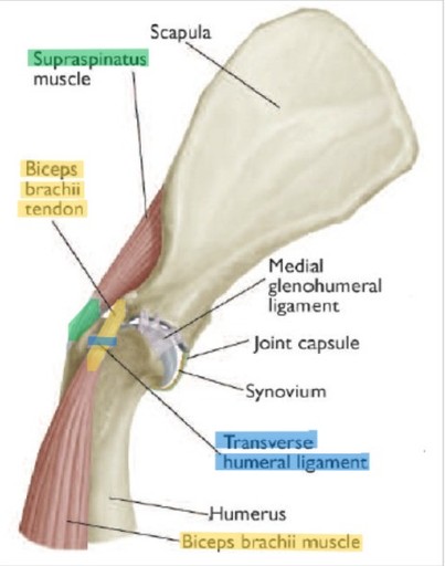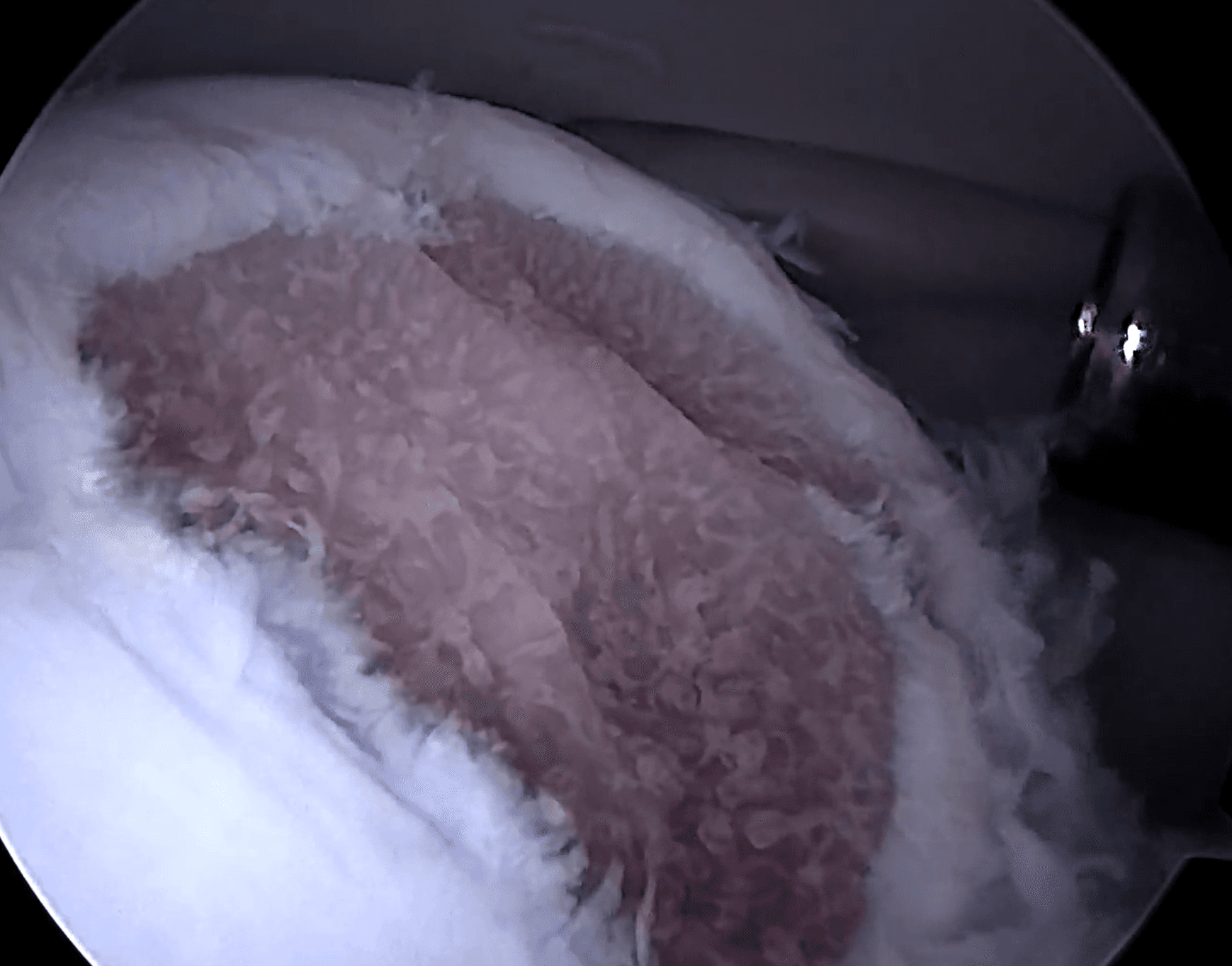 Biceps Tendinopathy involves irritation or damage to the biceps tendon which affects the tendon’s ability to glide through the biceps groove. This can occur either from sources within the joint, like wear and tear damage to the biceps tendon itself or irritation from a migrating OCD lesion. Alternatively, impingement of the tendon can occur outside of the joint from sources like a mineralized supraspinatus tendon.
